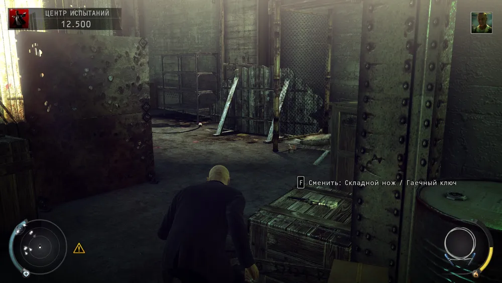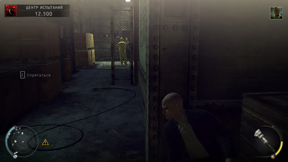 оттуда прячемся за ящик на левой стороне, бросаем ключ