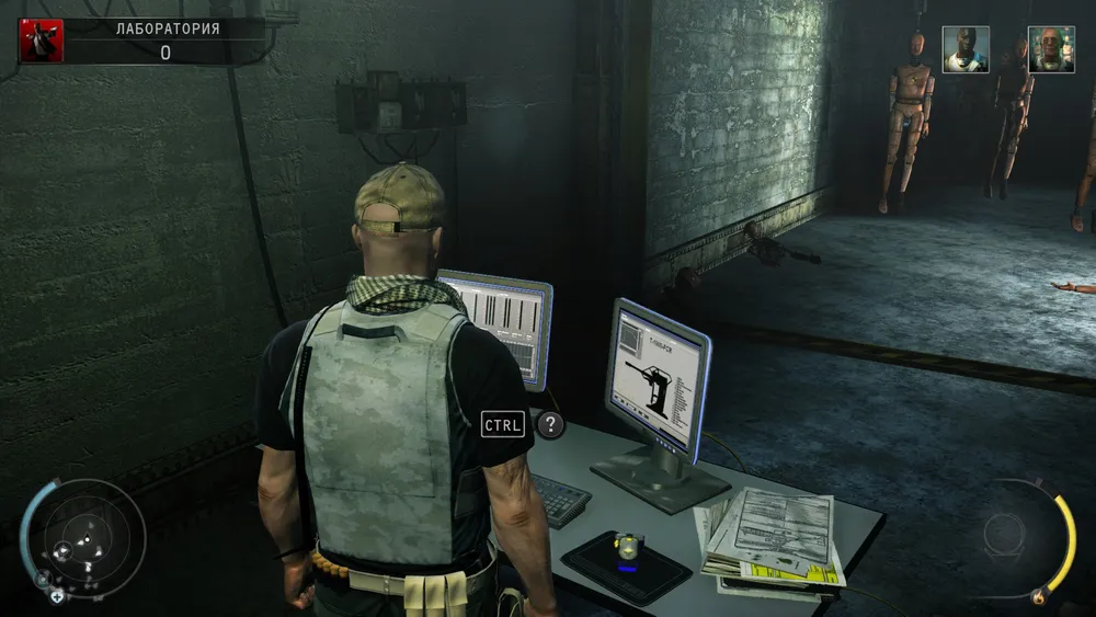 можно его и придушить здесь, отвлекаем ученого кидая бутылку в стену перед манипулятором, ученый идет к стене, становится к нам спиной, прямо в камере душим доктора и тащим его по часовой стрелке в шкаф.