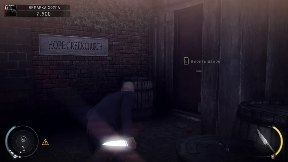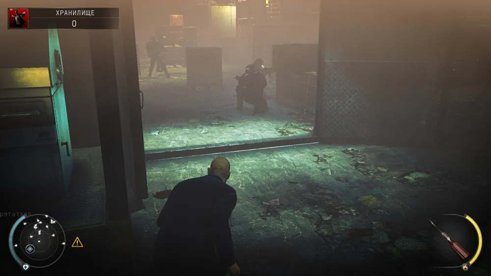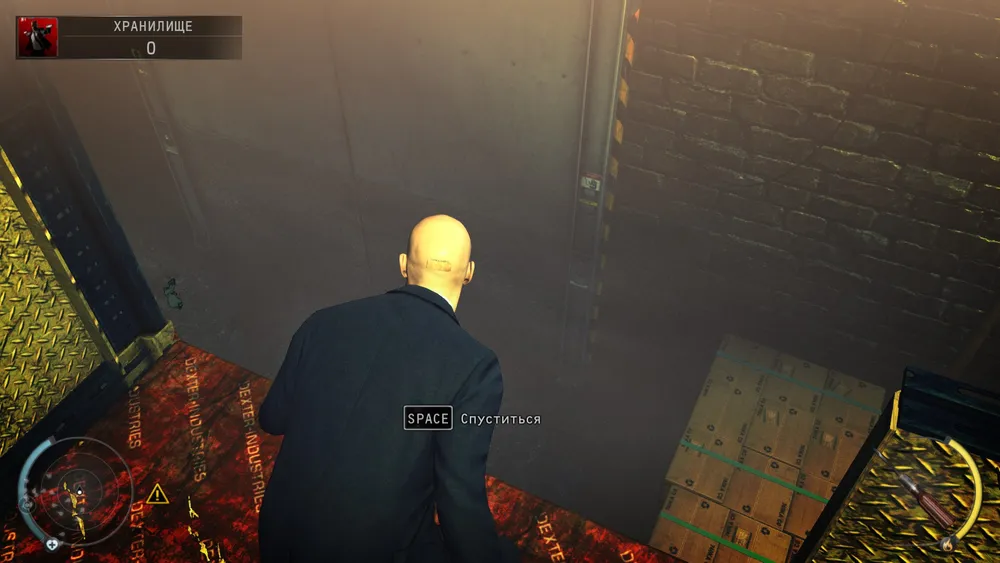 и прижавшись к стене по часовой стрелке минуем повернувшихся охранников, далее надо быстро добежать до ящиков