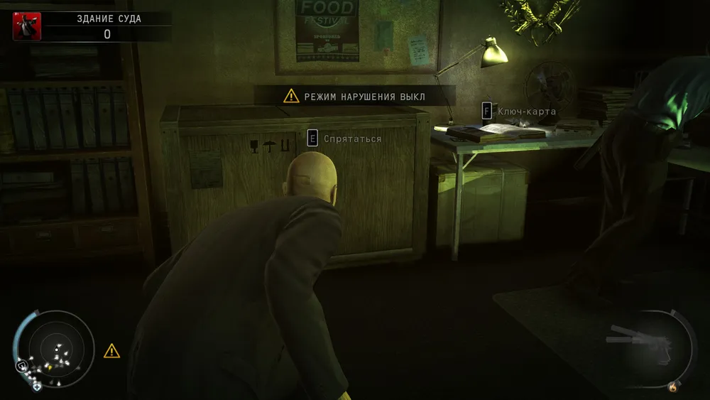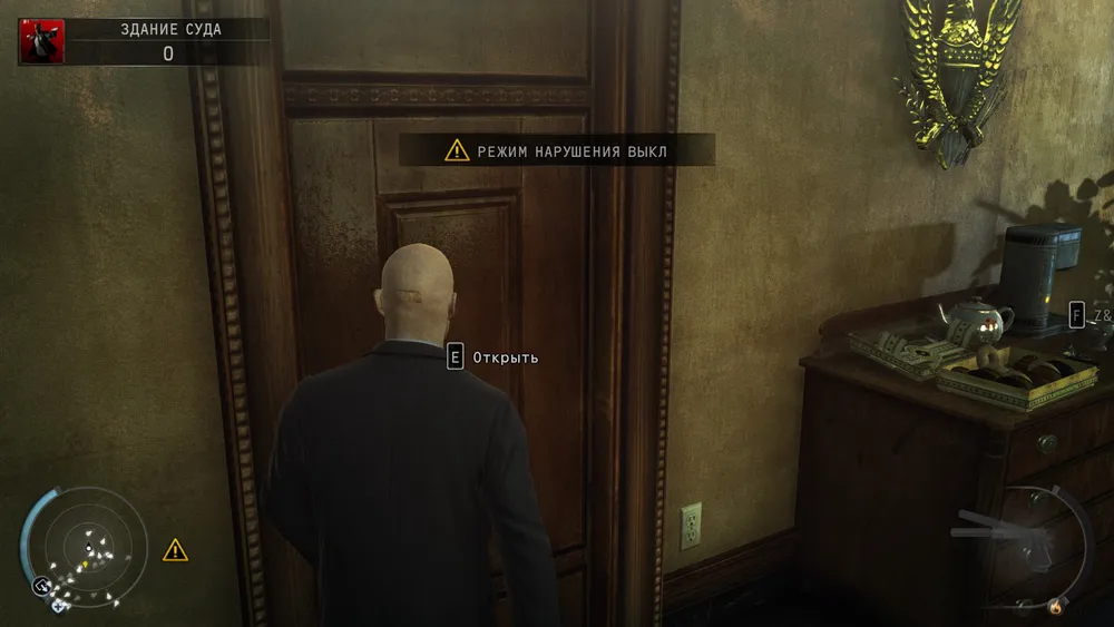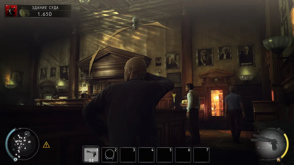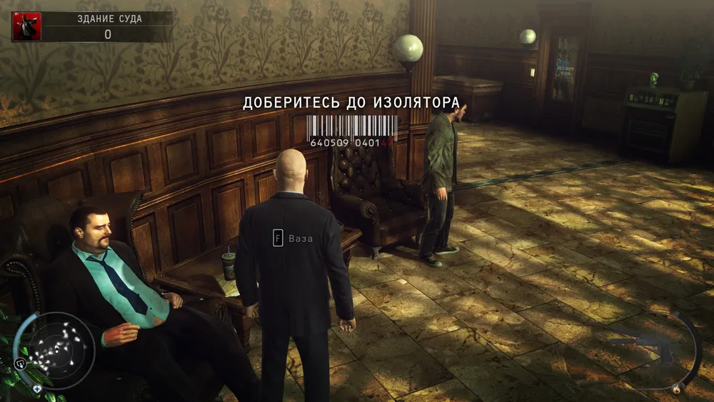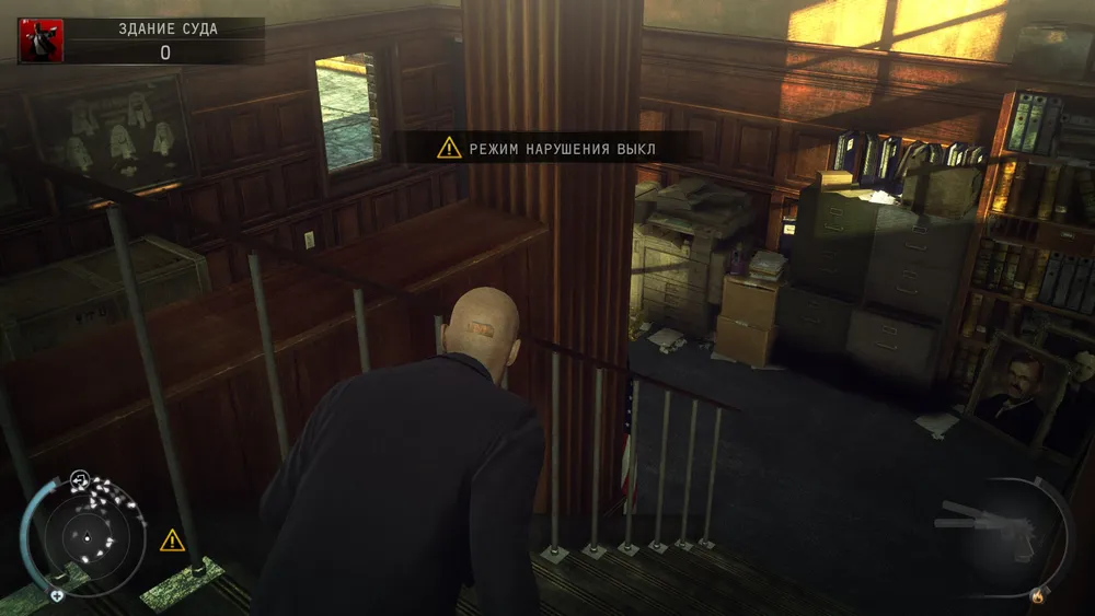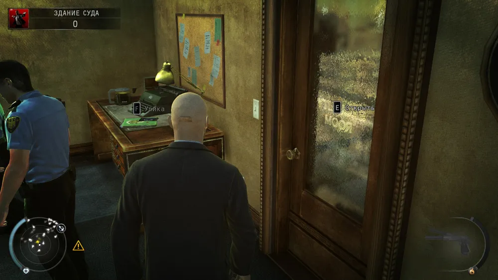 Правда костюм охранника здесь ничем не поможет. В начале уровня инстинкт на нуле, и даже если вернуться в помещение суда, он только осложнит жизнь, придется прятаться и от охранников,а уж взять улику превратится в кошмар. Рядом с входом в помещение с костюмом