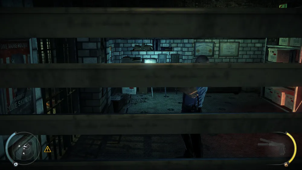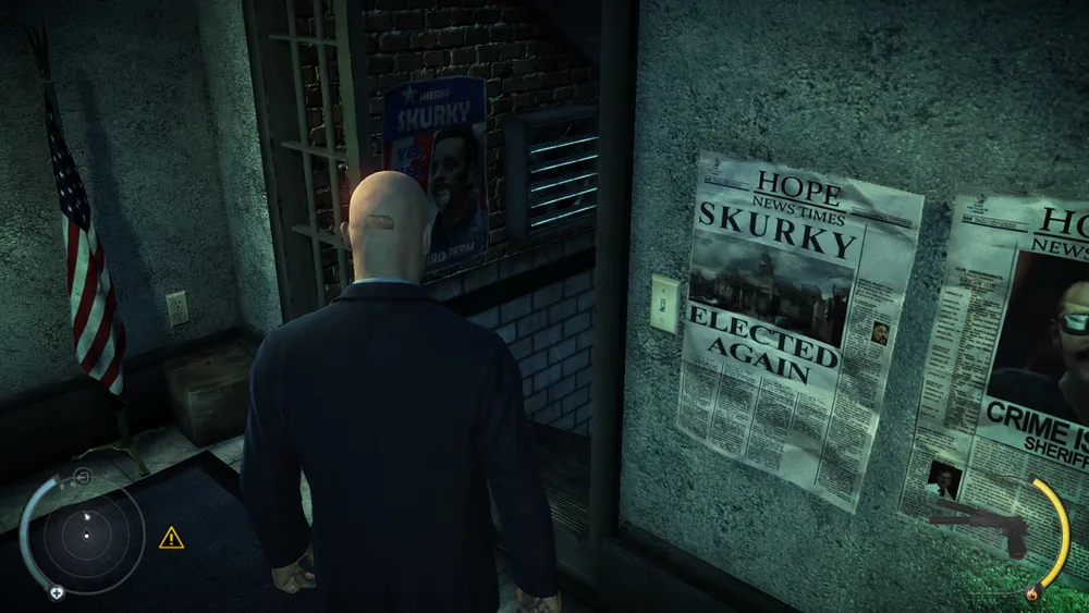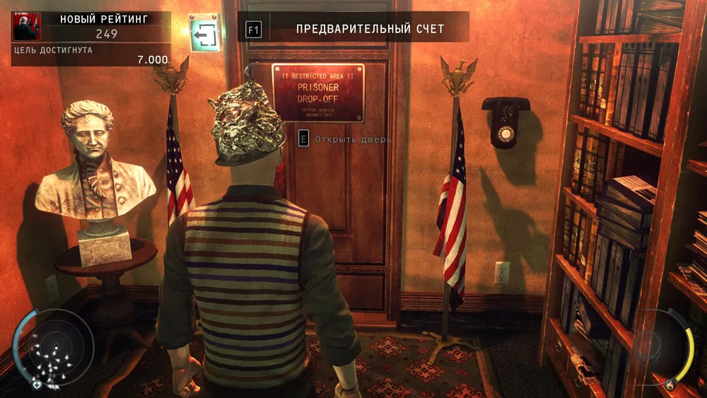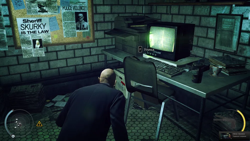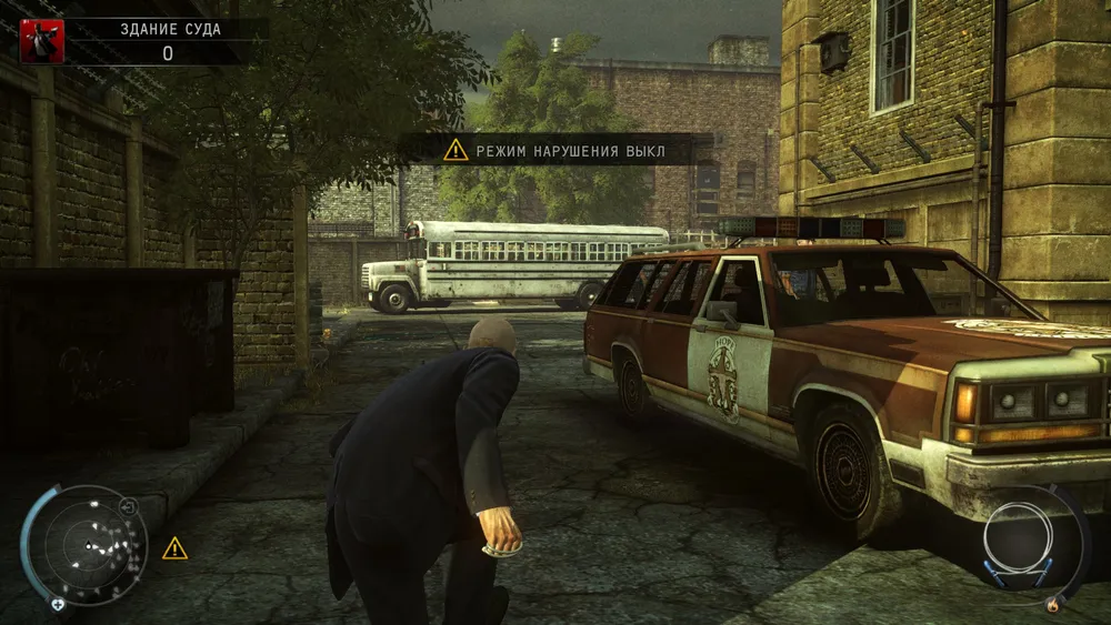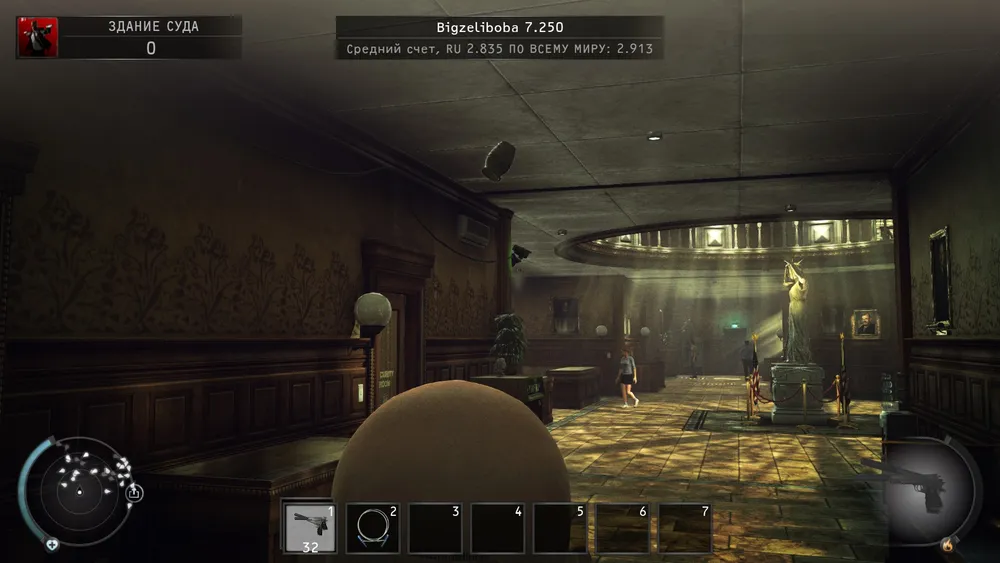 Правда костюм охранника здесь ничем не поможет. В начале уровня инстинкт на нуле, и даже если вернуться в помещение суда, он только осложнит жизнь, придется прятаться и от охранников,а уж взять улику превратится в кошмар. Рядом с входом в помещение с костюмом