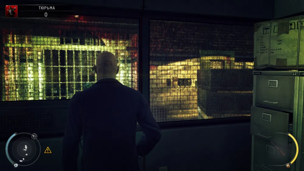 ждем пока закончит движение охранник слева у стеллажей и пролазим в окно.