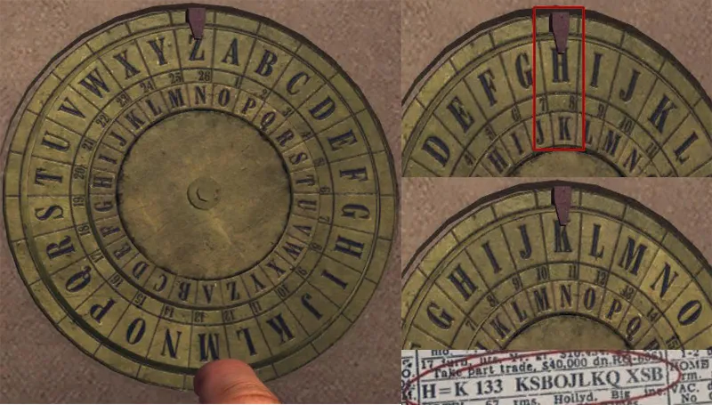На месте взрыва осматриваем трупы. От трупов вперед и налево, затем направо, находим деталь самолета. Возвращаемся обратно и поворачиваем на право, находим рубашку. Впереди осматриваем содержимое чемодана. Решаем головоломку – передвигаем внешнее колесо до буквы Н,нижнее до буквы К,так чтобы они сравнялись вертикально. Затем двигаем внешнее колесо на буквы KSBOJLKO XSB(указаны в газете).