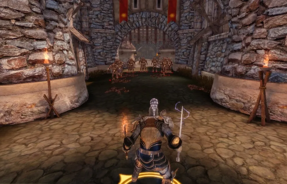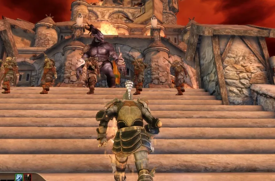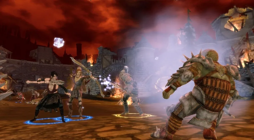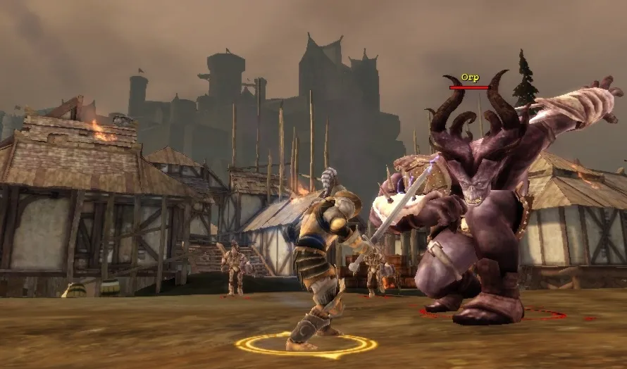 Прибыв в город, вы увидите, что он уже горит. Небо заволокло дымом… Короче, декорации соответствующие. Ваше первое задание – бегать по площади перед городскими воротами и убивать рассеянные группы Порождений Тьмы. Ваши соратники будут сражаться рядом, но не в группе, и управлять ими не получится.