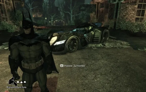 После боя забираем из багажника взрывчатый гель (им можно взрывать неустойчивые стены). Теперь нужно отсканировать местность вокруг автомобиля. Включаем режим детектива и сканируем, зона поиска очерчена желтой полосой. Найдя трубку нажимаем пробел, просканировав бэтмен связывается с оракулом и сообщает ей хорошие новости. Следуем по витающему в воздухе аромату любимого табака комиссара. Чтобы пройти на следующую локацию, слева от запертых ворот взрываем непрочную стену. Идя по следу натыкаемся на двух бандитов побив их продолжаем выискивать следы табака, благо они есть каждые три метра.