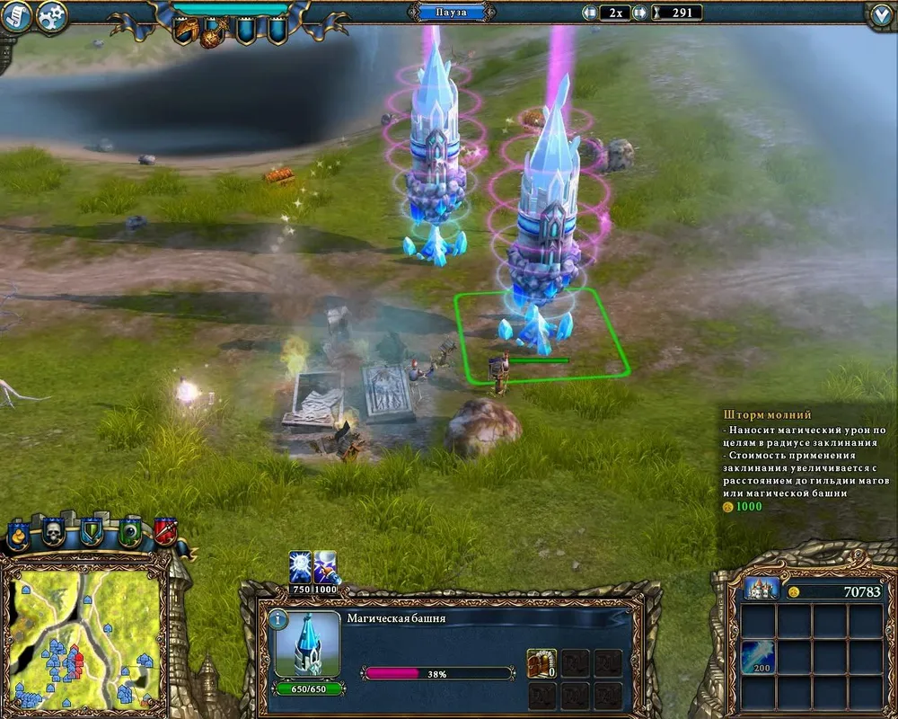 Кстати, с появлением гильдии магов у вас появится сразу несколько любопытных способностей: всем героям можно зачаровать оружие, чтобы оно наносило магический урон; в ваше распоряжение, Сир, поступает заклинание «Молния» и возможность строить магические башни. И, конечно, появляется возможность нанимать магов…
