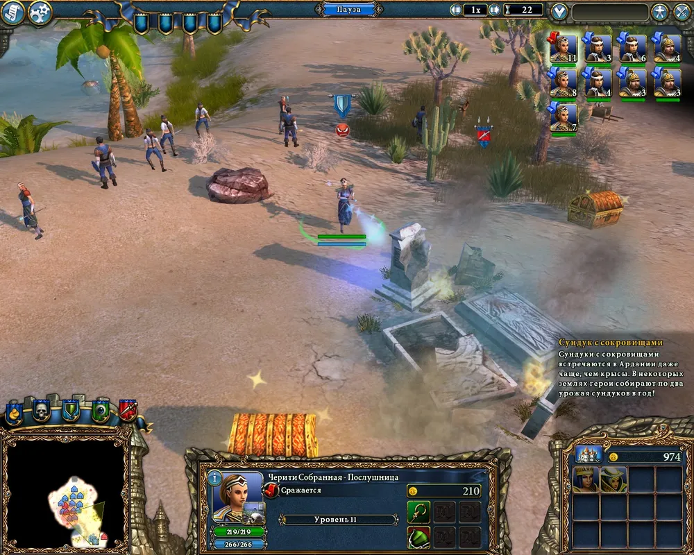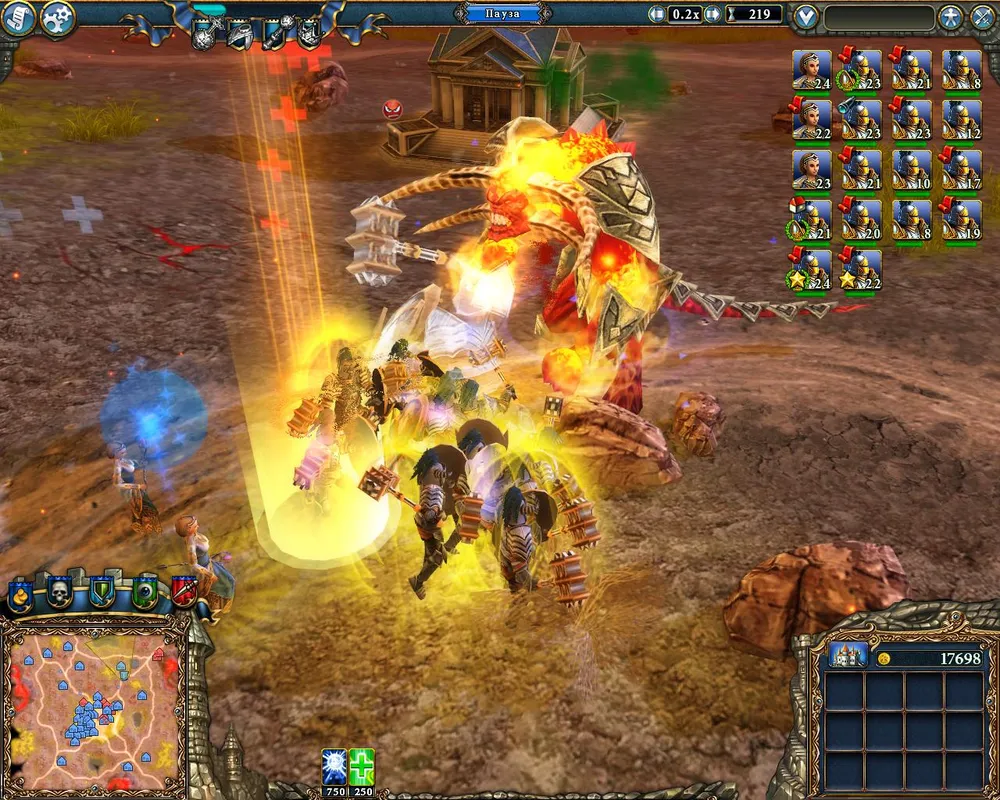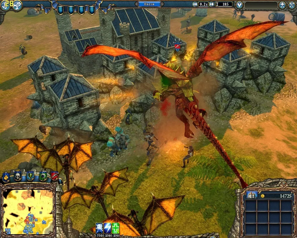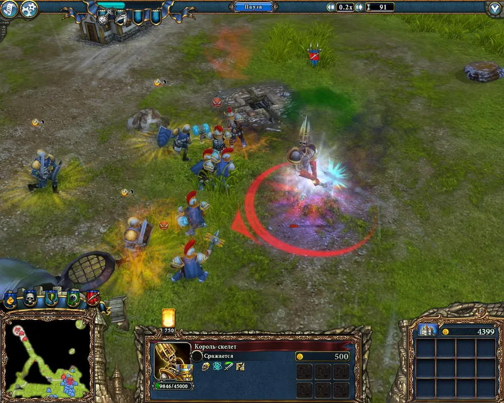 Знакомство с Андревусом начинается с его довольно мощных магических атак на замок. Уничтожить замок таким образом ему не удастся, а вот разрушить гильдии и убить начинающих бойцов – запросто. Поэтому все постройки стоит возводить как можно ближе к нижнему, южному краю карты.