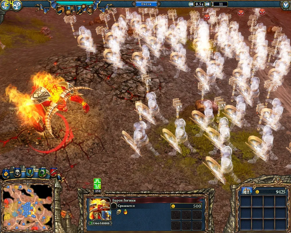 «Решив побыстрее накопить золото, я ускорил время до 2,0 – и на несколько секунд прозевал момент активации короны. За упущенное время Барлог успел добежать до столицы и принялся крушить здания, начав с кузницы. Дух Королей был вызван в правом верхнем углу карты, но… Барон Логики настолько увлёкся разгромом столицы, что не обратил никакого внимания на нового противника, предоставив решение этой проблемы своим огненным элементалям. Хорошо, что я сохранился незадолго до этого момента…»