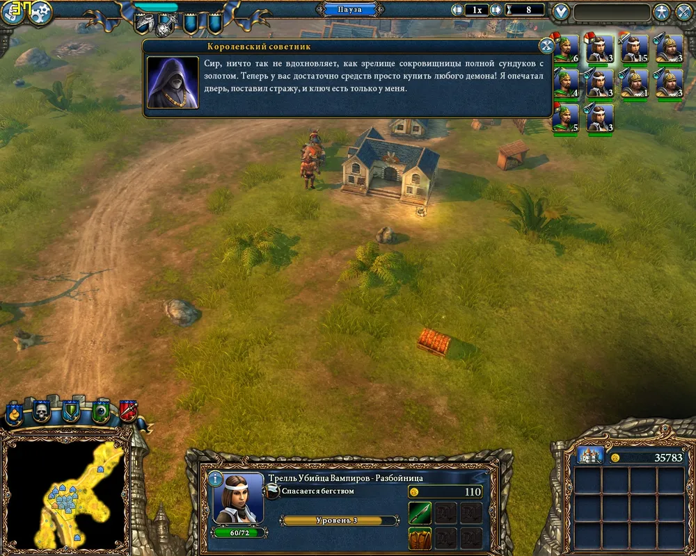 Не унывайте, Сир - у вас же есть лорды! Первым делом строим зал Лордов и приглашаем разбойницу – наступил её звёздный час. Девушка быстренько проведёт разведку, разрушит ближайшие логова – а тем временем в казне потихоньку накапливается золото.
