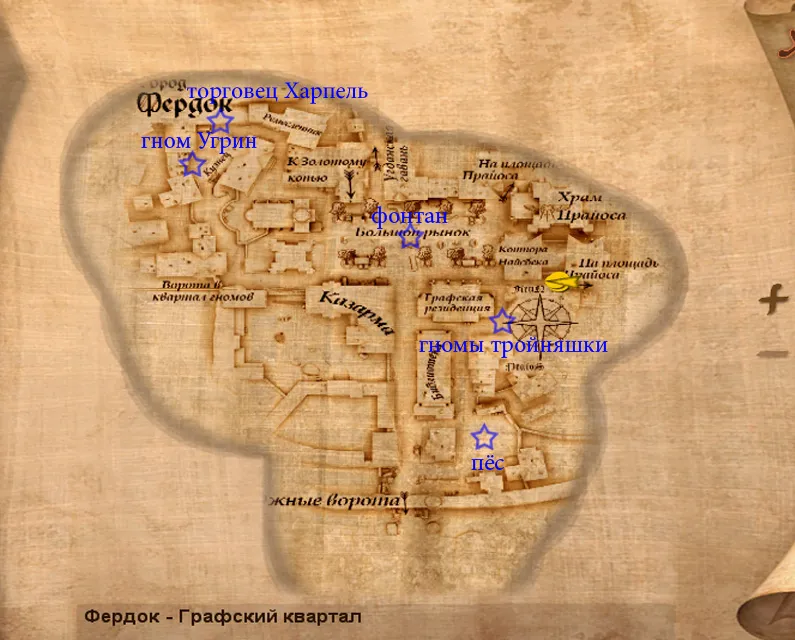 В Графском квартале также можно найти трёх гномов – близнецов. Тройняшки предложат сыграть вам в забавную игру. Они начнут быстро бегать и меняться местами. Ваша задача, после всех их перемещений, отыскать того гнома, который и предложил эту игру.Угадать довольно просто, нужно всего лишь внимательно следить за гномом во время его перемещений. Чтобы сыграть нужно заплатить 1 дукат, в случае выйгрыша получите 2.