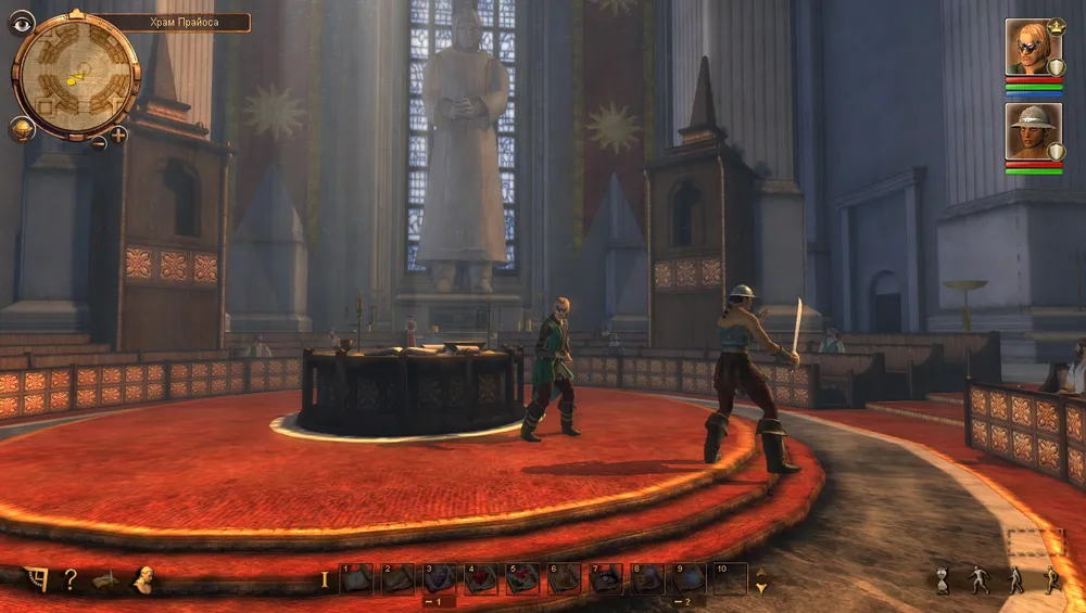Перед тем как покидать Площадь Прайоса обязательно зайдите в храм этого самого Прайоса. Помимо того что изнутри он действительно смотрится красиво(левелл дезайнеры пострались на славу:), так местный жрец ещё и вознаградит вас опытом. Правда сначало придётся ответить на несколько его вопросов о богах и религии. Правильные ответы находятся под номерами: 1, 4, 1, 2, 3. За каждый верный ответ получите по 8 опыта, следовательно за все 5 вопросов 40 единиц опыта