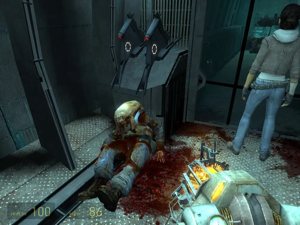 Хватаем самую жирненькую из них, с помощью правой кнопки мыши, и бегом на лифт (на укусы остальных внимания не обращаем — здоровья валом, а много они не накусают). Тащим трофей к Аликс и держим перед ней, пока мадмуазель не перепрограммирует систему наведения.
