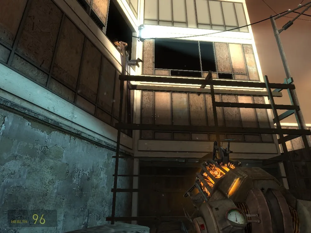 Аликс лезет наверх оглядеться. Подобрав оставшуюся бесхозной снайперку, Аликс состреливает нам лестницу с балкона правее — залазим и спрыгиваем во двор. С трех сторон выходят зомби и зомбайны — убиваем (если держать их подальше от забора, то в отстреле активно поможет Аликс). Наш путь лежит в дальнюю дверь направо. Заходим. Справа за углом притаился ядовитый хэдкраб — убиваем или выманиваем под огонь Аликс. Продолжаем путь в доме наверх по лестнице.