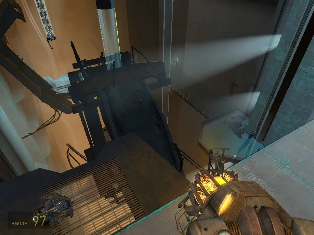 Снова правее и по наклонному контейнеру наверх, потом налево и снова в открытый контейнер. Следующий удар страйдера открывает дверцы с другой стороны, а из ракеты вылазят два ядовитых хэдкраба. Убиваем и вперед.