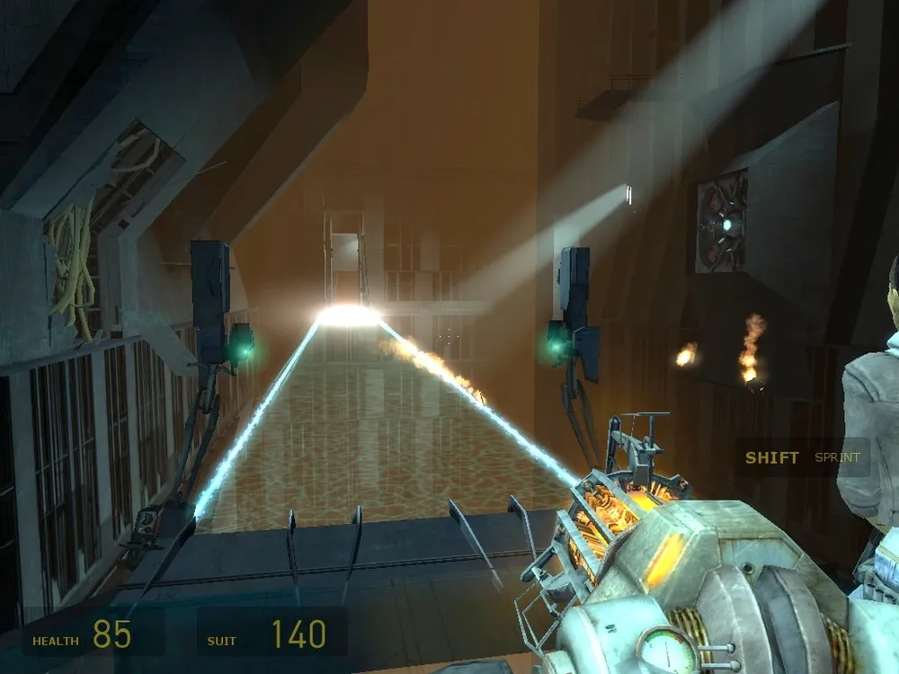 Выходим на мостик и видим пульсирующее ядро реактора. Нам необходимо перебежать на мостик слева в тот момент, когда ядро максимально сжато, иначе будет Гордон, запеченный в собственном соку. Пробегаем с ускорением (кнопкой Shift), по мостику и дальше в проход слева, где убиваем четверых солдат.