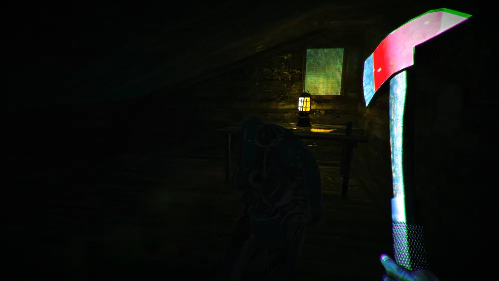 Теперь с нами Акс! Сказать по правде, теперь игра становиться не такой страшной, особенно если включить Slipknot, AOV, к примеру. Вооружившись топором и брутальностью, выдвигаемся к дому-коробке, вход которого забит досками. Прорубив вход, берём ключ от главного входа Green Inn. Попав вовнутрь, сэйвимся, проверяем комнаты, видим знакомую надпись "Не оборачивайся".
