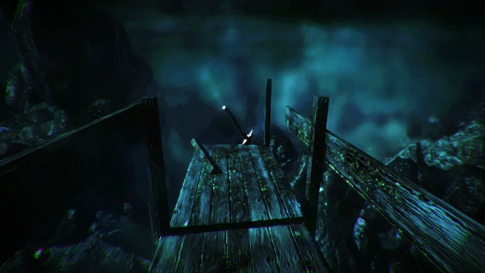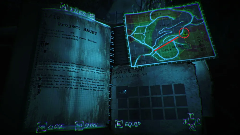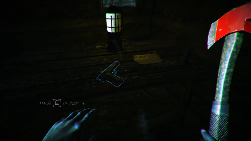 Двигаясь вперёд по дорожке, с обеих сторон выложенной брёвнами, мы доходим до автомобиля, на капоте которого лежит фонарик и карта. Пикапнув всё это, мы получаем доступ к инвентарю, карте и документам, которые мы сможем найти на протяжении игры. Отправляемся дальше, взяв канистру с бензином у машины.
