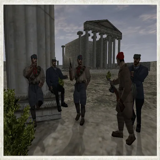 Миссия на нападение. Нужно с боем пробиться на скалу с храмом и собрать отряд у входа на базу. Есть 2 пути и 2 дороги, одинаково сложные. Если иди по главной дороге то придётся что то делать со стоящим на открытом месте танком. Если же идти по реке то будьте готовы к сильному огню пехоты с храма. В самом храме охраны тоже хватает. Главная опасность - люди с ППШ.