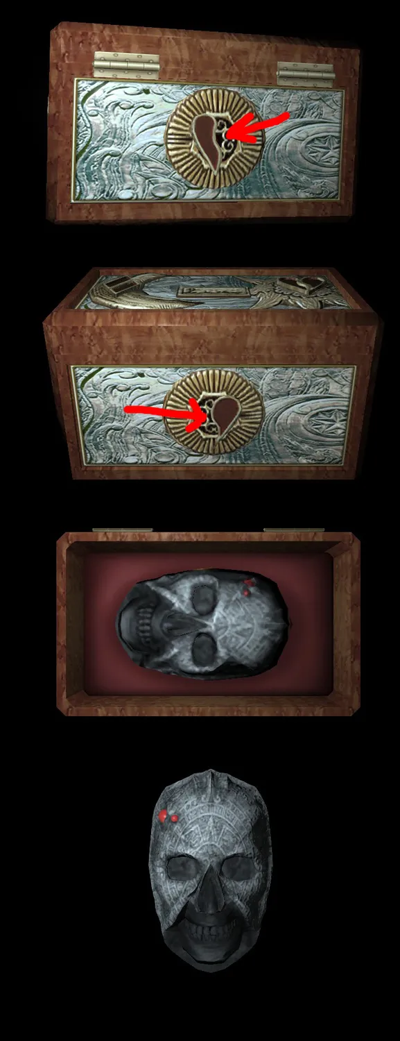 Теперь надо эту шкатулку вскрывать. Открывайте инвентарь и нажмите «Изучить» у шкатулки. На крышке есть изображение поделенного на две части сердца. Найдите на боковых стенках шкатулки эти половинки сердца и нажмите на каждой кнопку «Действие», после чего открывайте шкатулку и забирайте еще одну Маску Смерти (2/4).