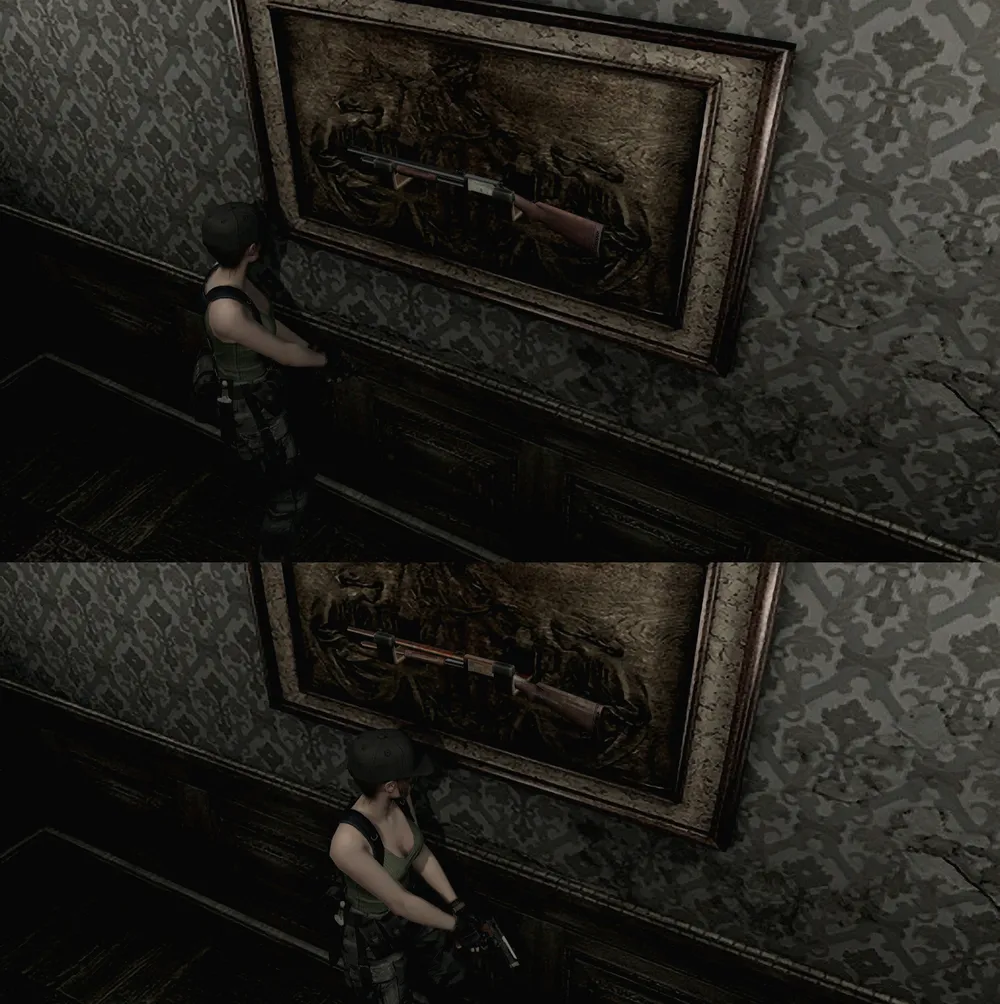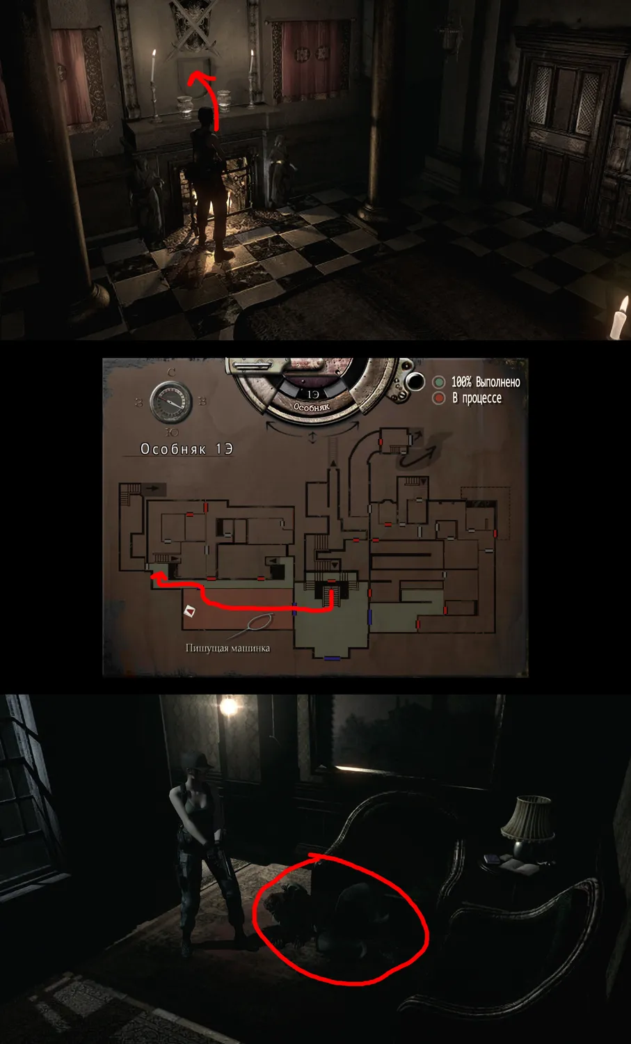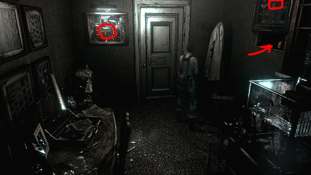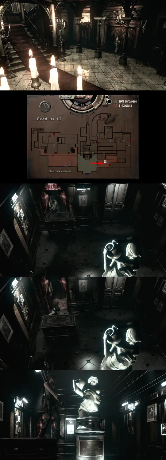 Для начала добудем карту первого этажа, чтобы нам было проще ориентироваться. Идем в единственную открытую дверь восточного (правого) крыла на пером этаже и попадаем в галерею странных фотографий, где по центру стоит каменная баба с кувшином. В кувшине что-то сверкает. Это и есть наша карта. Обходим бабу и видим шкаф, что плотно стоит у стены. Забираемся на него и перелезаем на другую сторону (клавишами «Действие»). Оказавшись в маленьком проходе, мы просто двигаемся в сторону шкафа и Джилл начнет его двигать к статуе. Когда шкаф будет достаточно близко – забираемся на него и берем карту из кувшина.