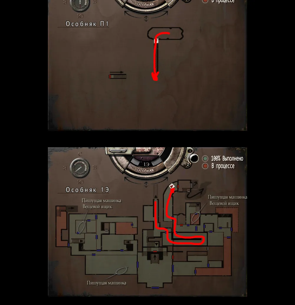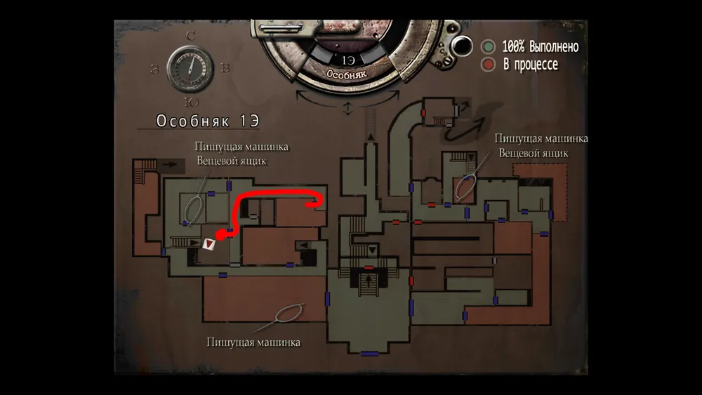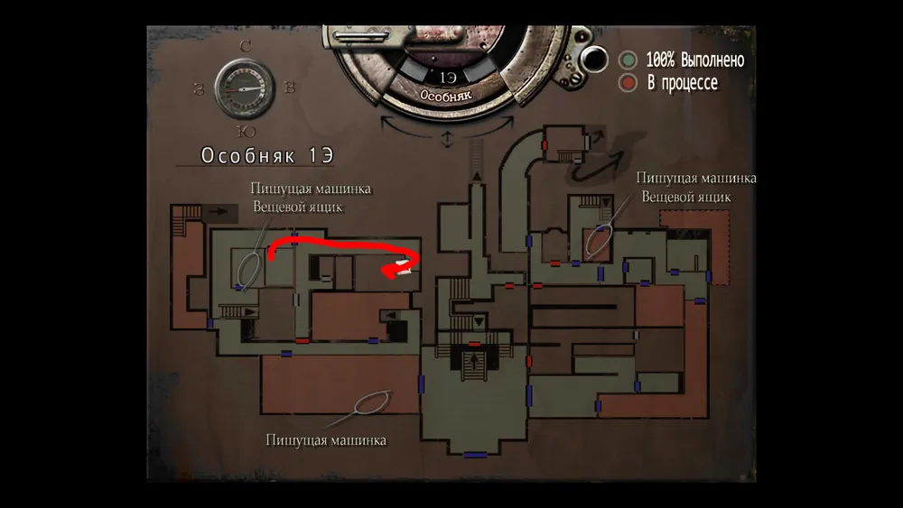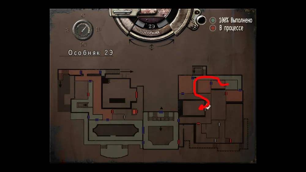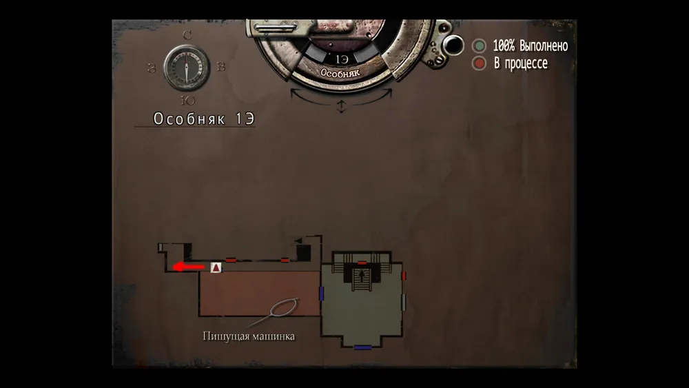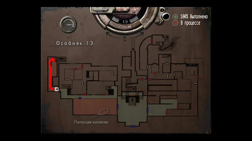 Выйдите из комнаты, поверните направо. Там будет помеченная на карте красным дверь. Откройте ее изнутри и выходите в коридор. Сразу напротив зайдите в столовую и пройдите ее насквозь. Снова зайдите в комнату с каменной бабой и фотографиями и откройте там дверь. Вы в знакомом длиннющем коридоре, только теперь тут врагов добавилось. Дойдите до конца и выходите из него. Далее насчитайте третью дверь (ну или просто предпоследнюю, о которой я говорил ранее) и зайдите в квадратное помещение. Там будет еще одна дверь, заходите.