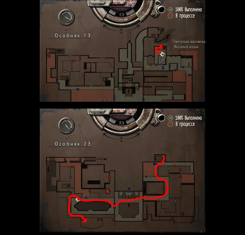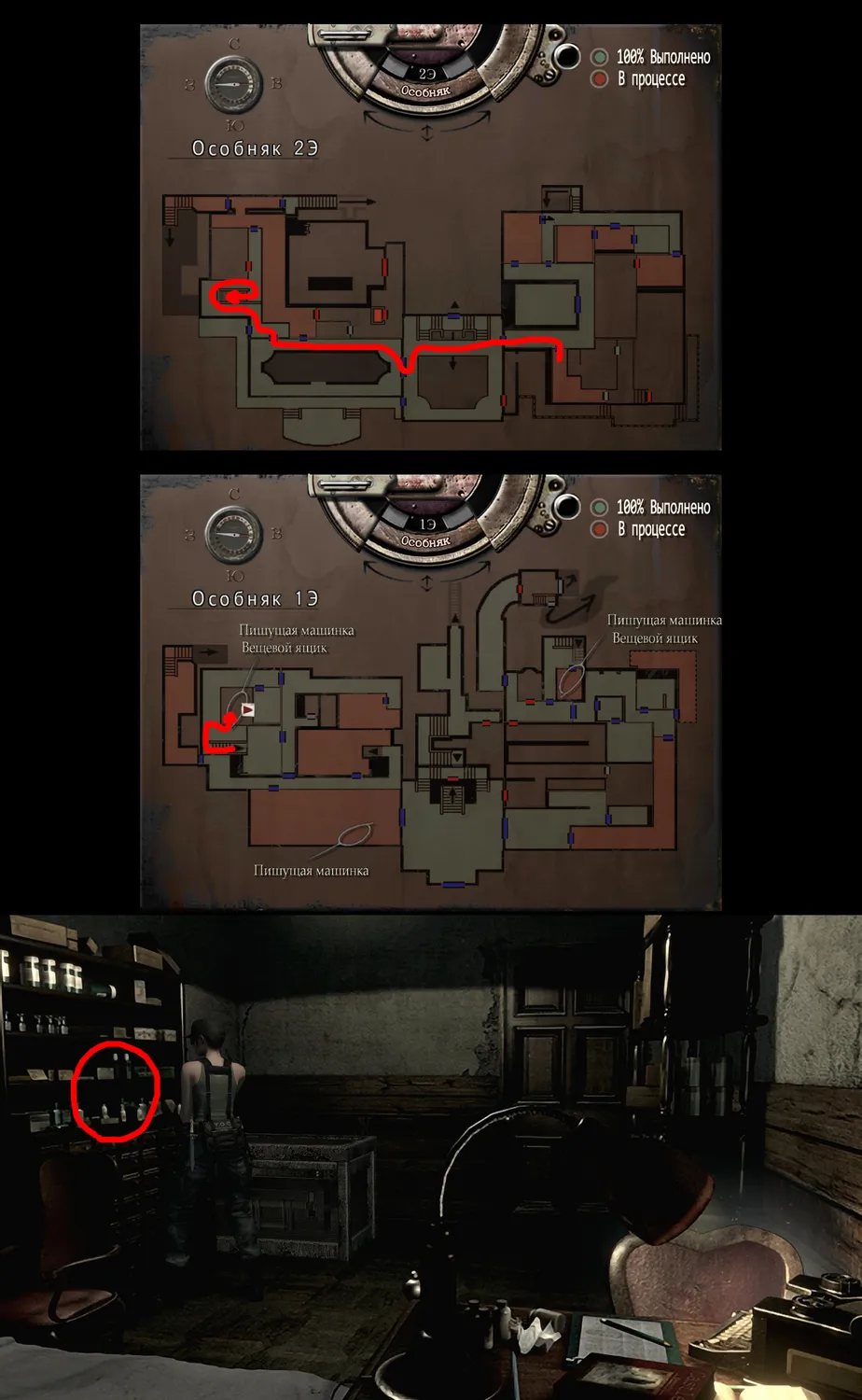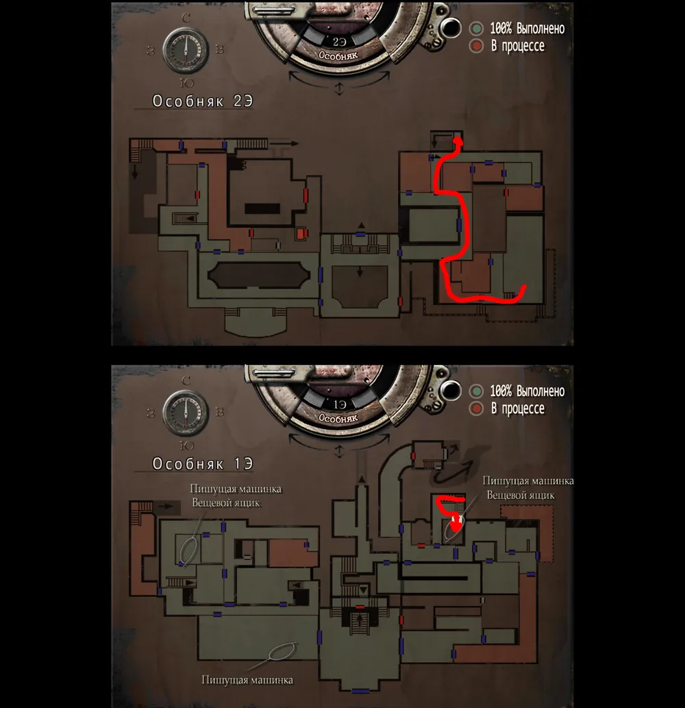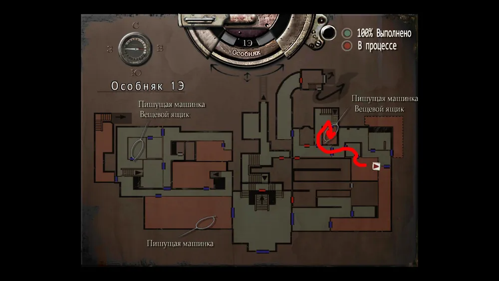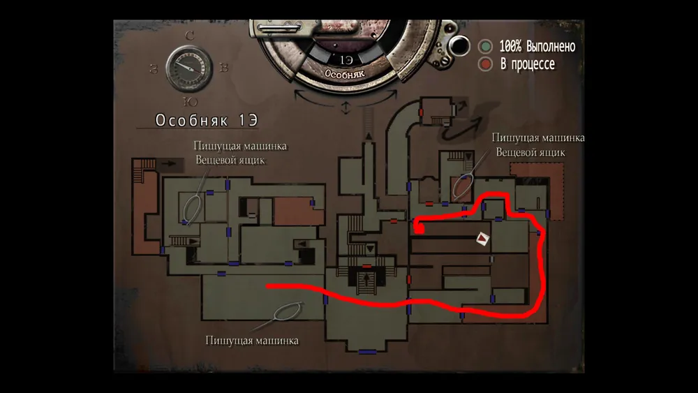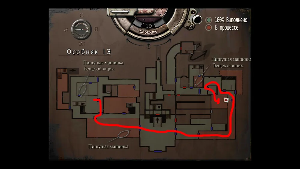 В таких комнатах всегда есть масса полезных вещей: патроны, аптечки, канистры с керосином, печатные машинки для сохранений, а также чудо-ящики, которые хранят все ваши ненужные вещи и телепортируют их от одного ящика к другому. Тут пока можно оставить деревянную эмблему, что вы взяли из столовой над камином и голубой кристалл. Так же можно оставить лишнюю траву, лишние патроны, и лишнюю ленту для печатных машинок и нож, особенно если вы нашли много патронов для пистолета. В этой комнате можно взять фляжку, в которую можно набрать топлива из канистры, чтобы жечь трупы. Перед ящиком можно найти инструкцию по сжиганию. Сжигать НЕ обязательно, так что можете просто кинуть фляжку в ящик, чтобы не мозолила глаза.