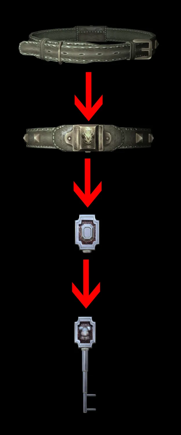 Далее предстоит небольшая игра с инвентарем. Найдите там полученный ошейник, откройте его через функцию «Изучить», а потом нажмите на пряжку кнопкой «Действие». Пряжка откроется и оттуда выпадет странная фиговина. Снова найдите ее в инвентаре и отройте через функцию «Изучить», переверните фиговину и еще раз нажмите кнопку «Действие» на ее задней стороне. Фиговина превратится в ключ. Но сам ключ нам не понадобится ведь у нас есть изображение ключа!
