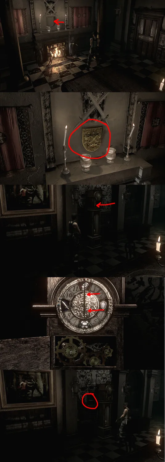 Вешаем золотую эмблему над камином. В часах, что стоят совсем рядом, откроется крышка механизма, и мы сможем выставить на них время. Обратите внимание, что на часах наши старые добрые четыре символа местных замков: меч, щит, шлем и доспехи. Нам надо, чтобы стрелки указывали на доспехи и шлем. Это ровняется шести часам. То есть оставляем минутную стрелку как она есть, а часовую поворачиваем два раза направо или налево, а потом отходим от часов. Они отъедут в сторону и можно будет взять ключ с гравировкой «Щит». Берегитесь, двери!