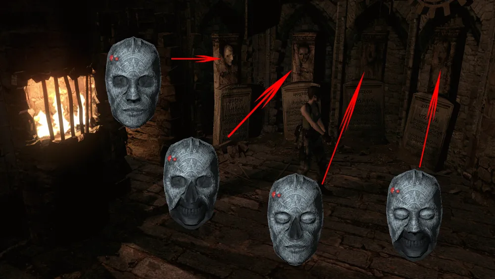 Тут будет небольшая загадка с последующей битвой. Здесь находятся четыре статуи, у каждой из которых свое отклонение от нормы. Нам надо одеть на них маски с соответствующими дефектами. Слева направо: статуя и маска без глаз; статуя и маска без носа, глаз и рта; статуя и маска без носа; статуя и маска без рта.