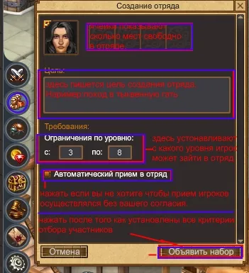 Там нужно выбрать критерии отбора участников . Например,с какого уровня можно вступать в отряд ?и т .д