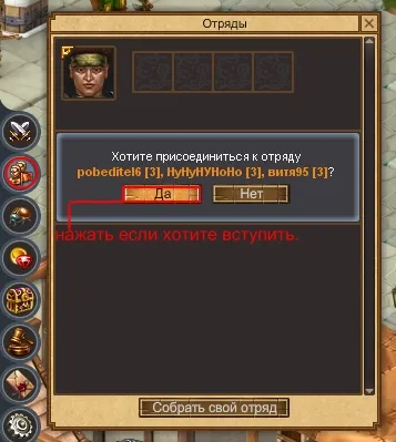 Как собрать отряд ?: жмете на круглую кнопку(левой панели вторая сверху),она называется «поиск и создание отрядов».Там вы можете найти группу, если вы ее нашли, то жмете на нее мышью и выплывет окошко «присоединиться к отряду?»И ,если вы хотите вступить ,жмите «да»