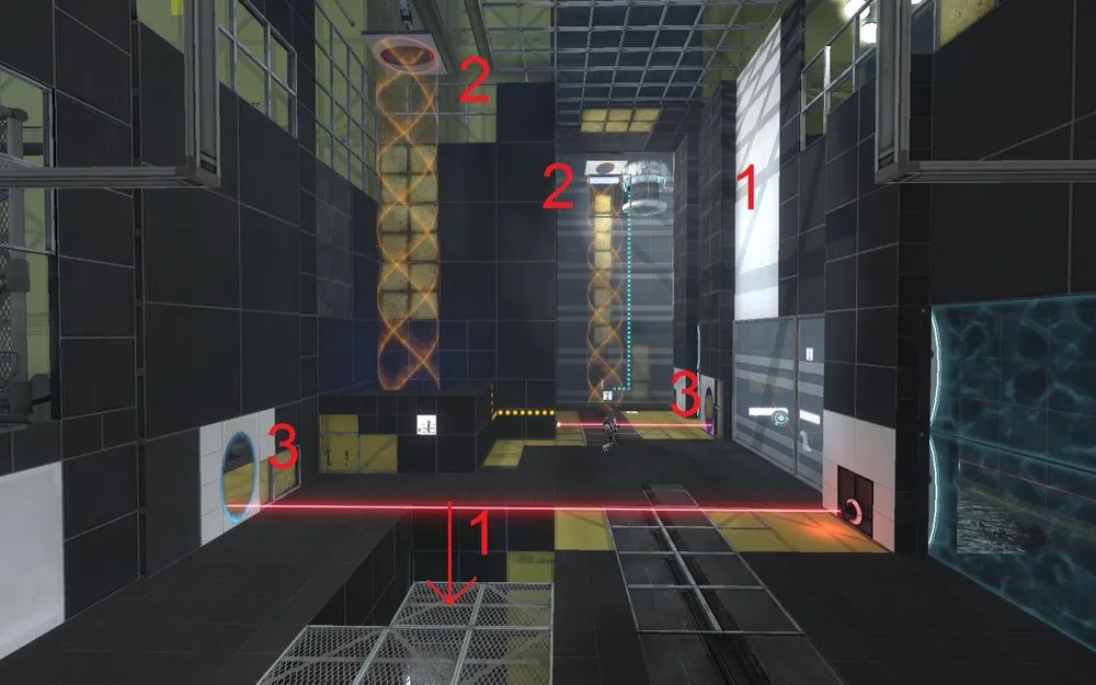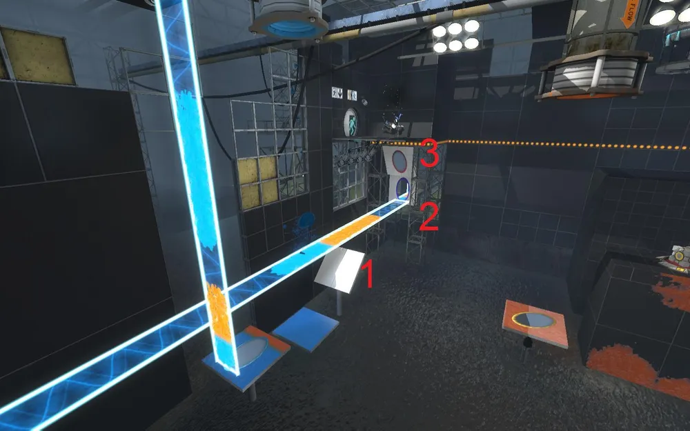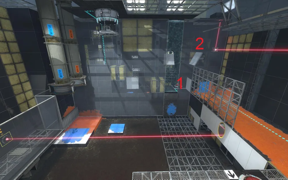Залейте синим гелем стену напротив комнаты с лазером с помощью наклонной стены (1 на скриншоте ниже). Портал оставьте, и с помощью друга вернитесь к ускоряющей полосе. Ставьте портал на крутящуюся дверь, разгоняйтесь и вот вы оказались в камере с лазером! Теперь попросите вашего друга передать вам кубик через порталы 1 и 2. Установите кубик перпендикулярно белой стене и можете слезать.