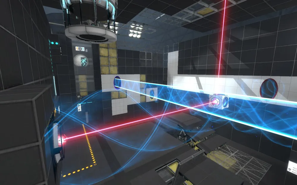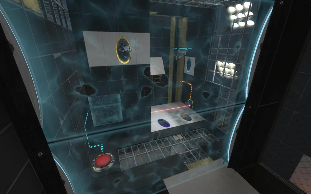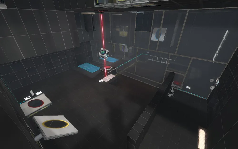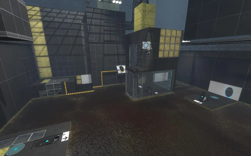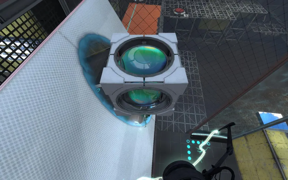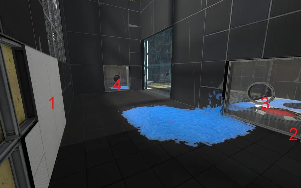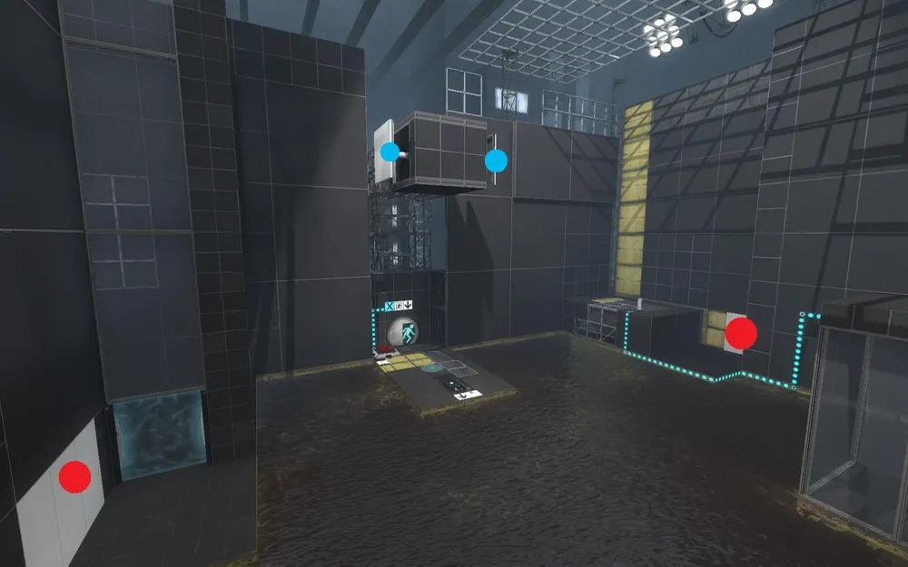 Чтобы открыть дверь, нам нужно очистить кубик, чтобы он не отталкивался от поверхностей. И не думайте, что это можно сделать, просто уничтожив его - новые кубики будут такими же отталкивающимися. Чтобы добраться до водяного насоса, носитель кубика должен поставить порталы там, где на скриншоте стоят красный и желтый.