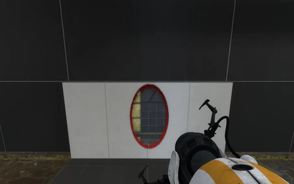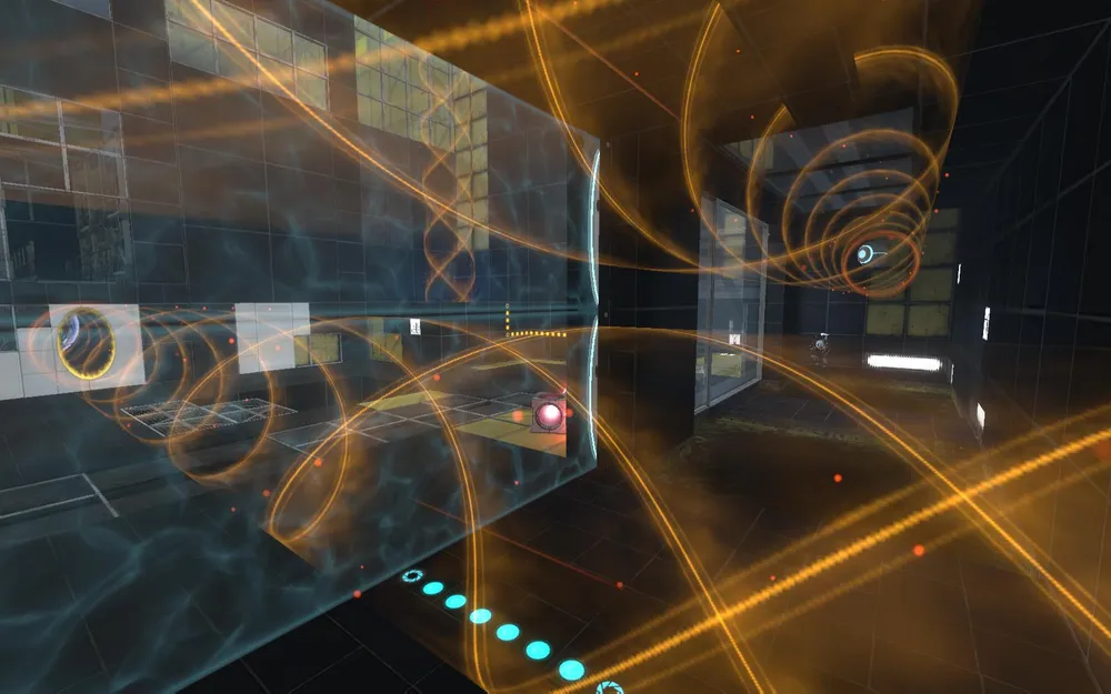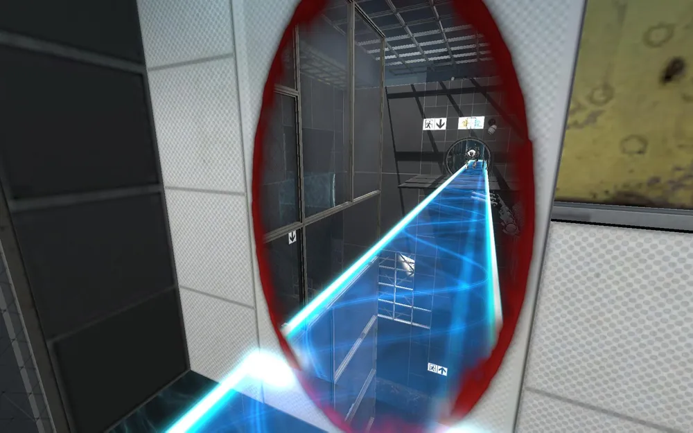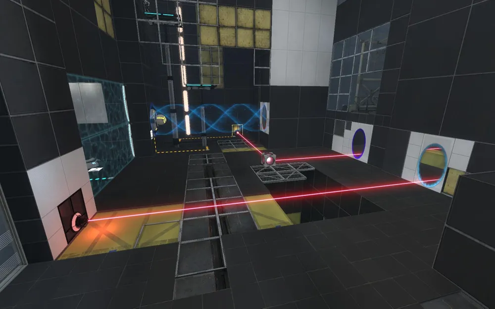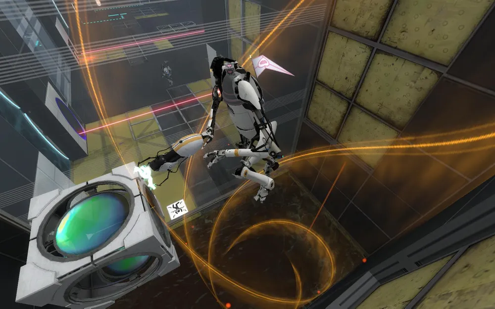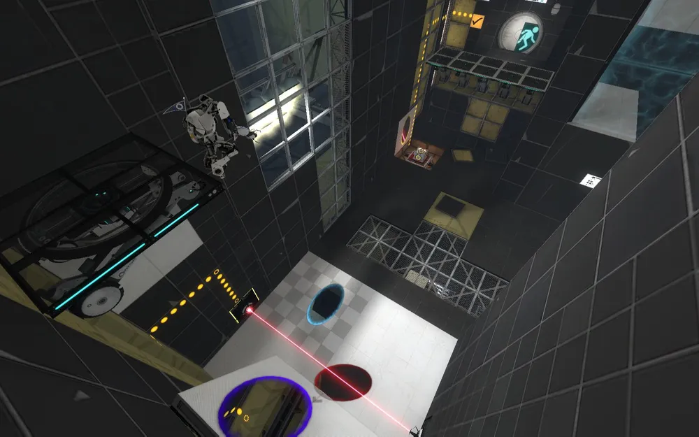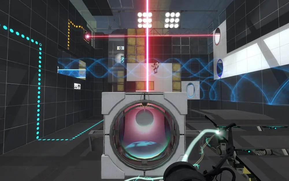 Чтобы открыть дверь, нам нужно очистить кубик, чтобы он не отталкивался от поверхностей. И не думайте, что это можно сделать, просто уничтожив его - новые кубики будут такими же отталкивающимися. Чтобы добраться до водяного насоса, носитель кубика должен поставить порталы там, где на скриншоте стоят красный и желтый.