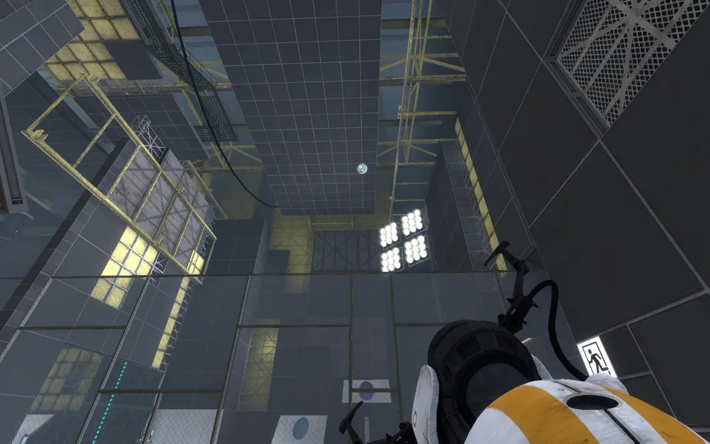 Игрок с кубом возвращается и проходит по мосту практически до выхода. С противоположной стороны будет белая стена, куда он должен поставить портал. Спускаемся вниз и заменяем кубик. Опять вместе забираемся наверх, но теперь ставим другой портал, проводящий световой мост прямо до конца уровня.