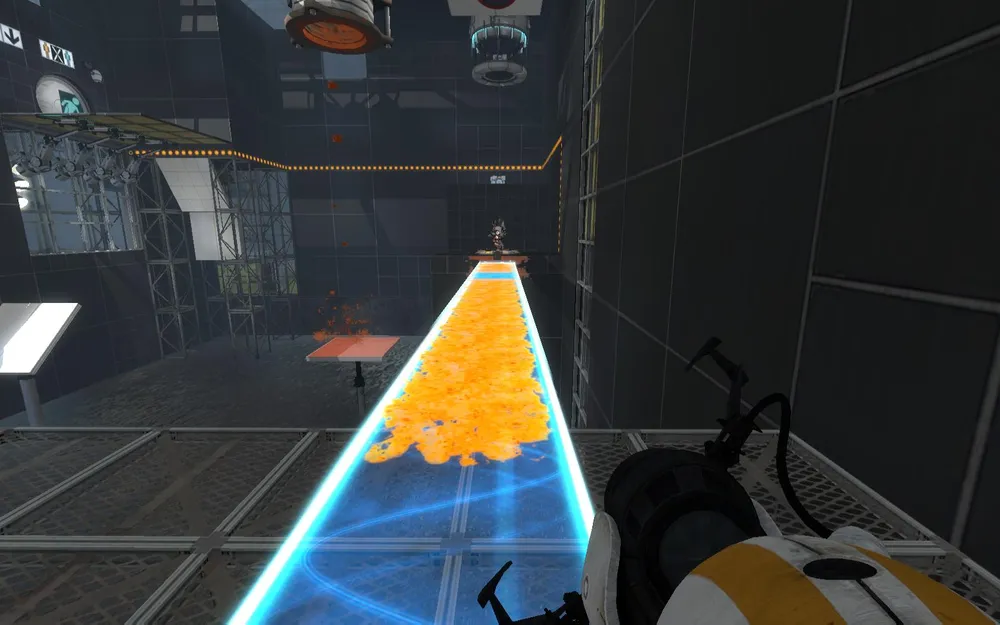 Перепрыгните на другую сторону, проложив мост (желтый и красный порталы) и вылив на обе стороны синий гель с помощью стенок вверху. Отскакивайте на другую сторону. Через мост можно запросто перемахнуть, используя покрытый гелем пол (где на скриншоте стоит голубой портал).