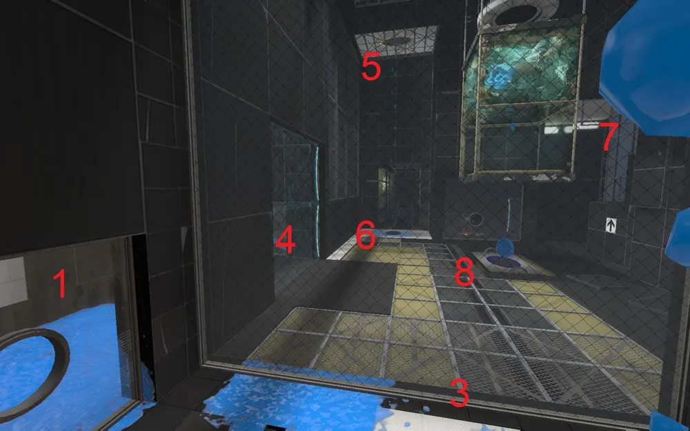 В это время ваш друг ставит порталы в точках 6 и 7. Синий гель позволит ему перепрыгнуть через поле конфискации и переставить портал с точки 7 на крутящуюся стену 8 (контролируемой пластиной). Куб теперь наш! Забираемся на уступ и проходим с кубом поле конфискации, убрав его с помощью пластины.