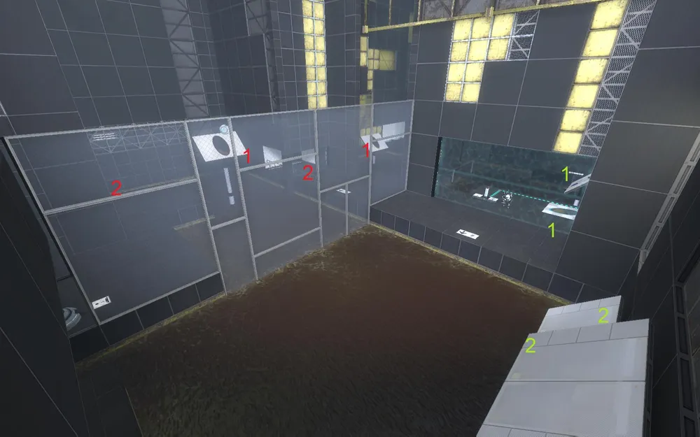 Чтобы выбраться из этой комнаты, нам нужно раздобыть преломляющий куб и куб без углов. Начнем с преломляющего куба. Пусть ваш друг поставит порталы в яме и стене напротив тоннеля (точки 1), в то время как вы проводите тоннель в точках 2. Влетайте в тоннель и продвигайтесь по нему, пока не дойдете до кнопки у самой кислоты.