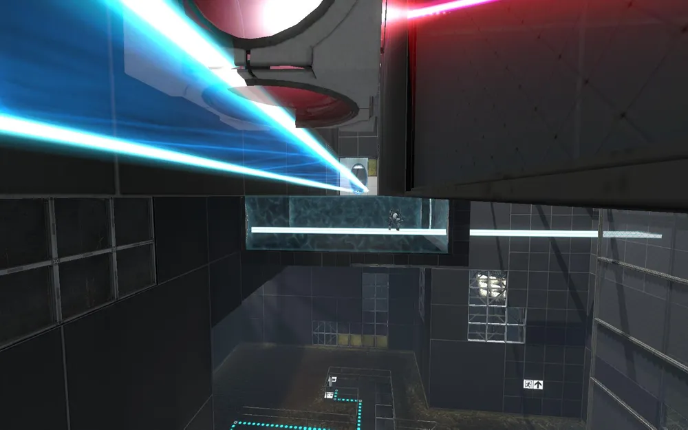 Далее, с помощью кубика надо перекрыть лазер и опустить таким образом лифт. Игрок без кубика забирается на лифт, поднимается и прыгает к водяному насосу. Он запускает подачу воды вниз, а носитель кубика подносит его к воде, чтобы очистить его.