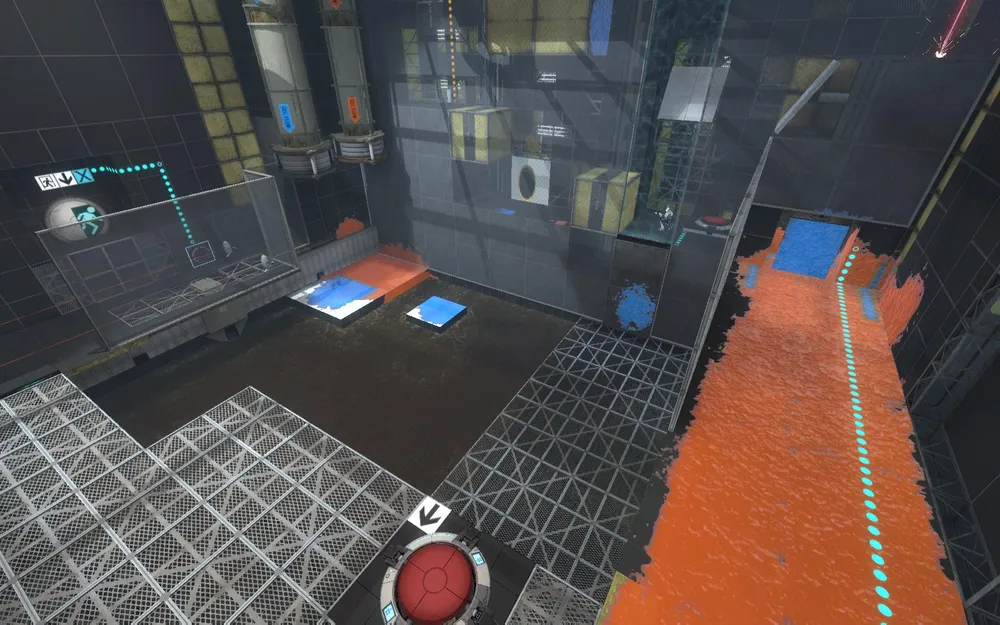 Перед нами обширное кислотное озеро. В комнатку справа пока заходить незачем, вам с ней ничего не сделать. Вам нужно добраться до кнопки в дальнем правом углу комнаты. Для начала, один из игроков готовит порталы в синих точках, в то время как другой помогает ему перейти с одной стороны на другую, ставя порталы в красный точках.