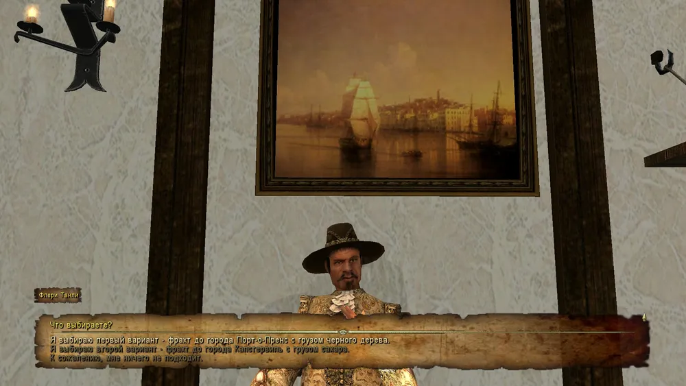 В любом городе торговцы могут зафрахтовать ваше судно на доставку товара. Например, из магазина Виллемстада нужно доставить двести двадцать единиц черного дерева в магазин Филипсбурга, что находится на Синт-Маартане. Доставку нужно осуществить в течение 26 дней. За доставку груза вы получите семь тысяч песо.