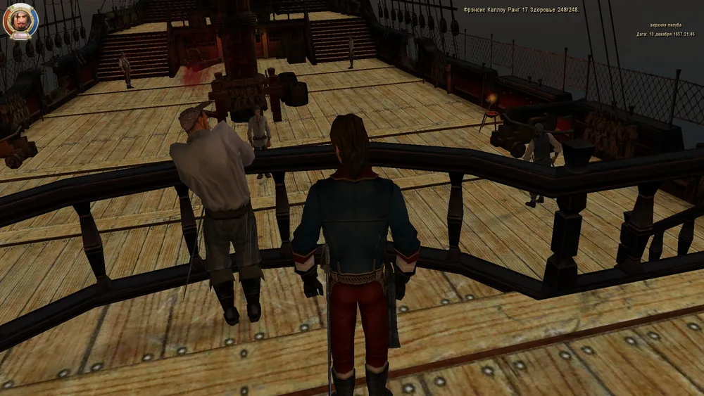 После сухопутного сражения возвращайтесь на свой корабль, чтобы дать бой испанской эскадре, состоящей из пяти кораблей. Четыре корабля из пяти можете потопить, а мановар «Сан Фелипе» лучше взять на абордаж и сделать своим кораблем посадив туда офицера и сделав его капитаном. Также, в сундуках, в каюте бывшего капитана находятся следующее вещи: мангароса, рабочий хронометр, буссоль, парадная кираса, отличная карта Теркса, карта Мартиники много песо и два сундука с дублонами. После боя возвращаемся в город и получаем от Мишеля наказ – прийти к аббату Бенуа на следующий день. Приходим к аббату на следующее утро и узнаем, что брата уже нет и получаем письмо от брата. Читаем его, а после говорим с аббатом.