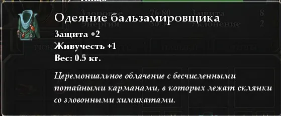 В нём одеяние бальзамировщика +2 защиты, +1 к живучести и бутылка с целебным зельем.
