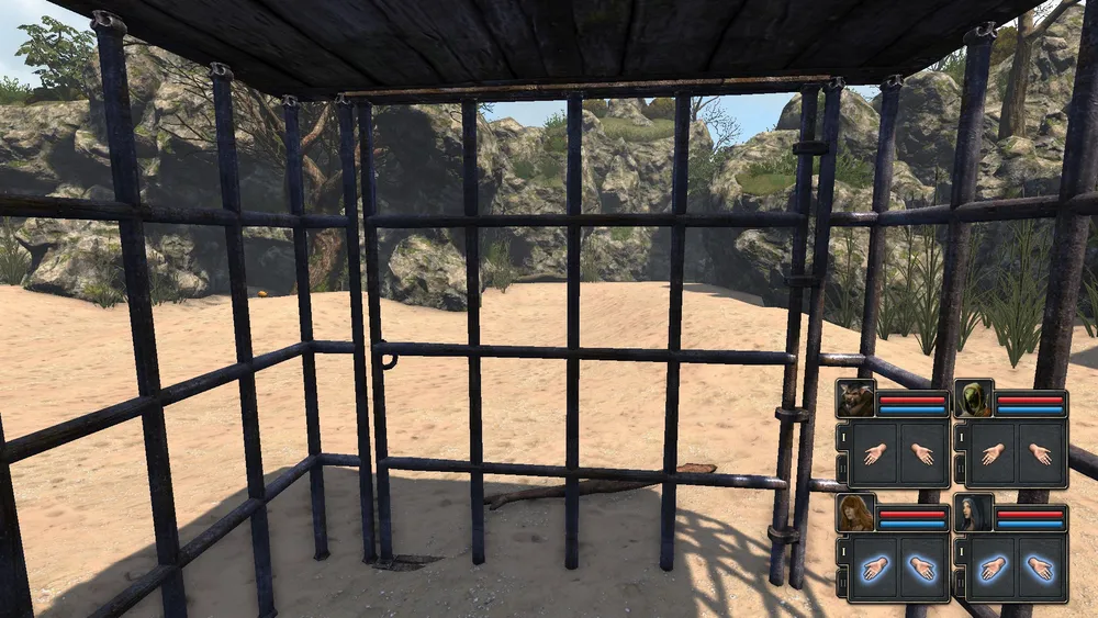 Начинаем игру, оказавшись выброшенными на берег в клетке после кораблекрушения.
