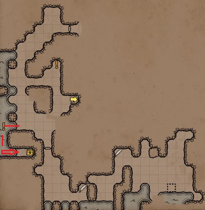 Подойдя к решётке, нажмем кнопку справа, та откроется. Пройдя сквозь небольшой коридор, поверните налево, к морю. В воде нас ждёт ещё одна водоросль. А чуть поодаль «затаилась» очередная черепаха. Обогнув камень, торчащий из воды, обнаружим первый секрет – сундук, в котором лежат ботинки +1 к защите, факел и деликатес – копчёный окунь. Продвинувшись дальше,в выемке справа от решётки найдём ещё один камень. Сама же решётка заперта на ключ.
