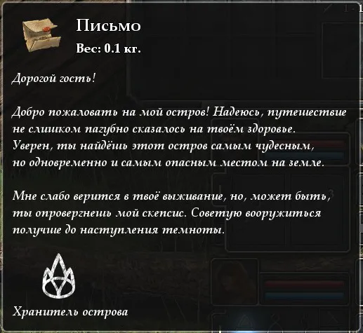 Справа от входа, около дерева, можно собрать несколько трав и гриб. На противоположном конце – стела с кнопкой. Нажимаем, открывается портал. За ним нас ждёт черепаха, мешок с пращой и 3 камнями в одном углу, закрытая решётка в другом. За решёткой нажимная плита, кладём на неё что-нибудь, решётка открывается. За ней сундук с кинжалом, бутылкой лечения и ключиком. Отходим, забираем груз с плиты, возвращаемся в портал. Справа от портала закрытая решётка, а рядом с ней стела с замком. Применяем ключ, решётка поднимается, за ней два мерфолка. Входим внутрь, подбираем ящик. В нём лопата , рапира и записка от капитана: «Я зарыл свои сокровища под ясенем вязом в тени голубого света».