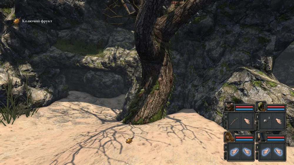 Вернувшись, идём вдоль скал, под деревом подбираем колючий фрукт(еду).