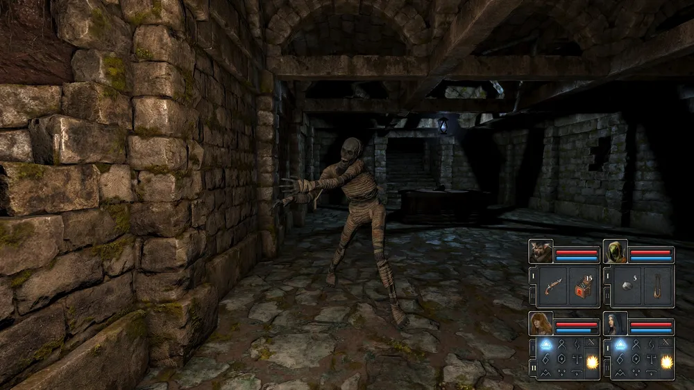 Спускаемся вниз. Поворачиваем направо, идём до упора, снова направо, поднимаем решётку. В дальнем конце комнаты подбираем отмычку. В нише забираем зелье лечения и свиток молнии. Возвращаемся к входу, не сворачивая доходим до упора, справа – решётка, ведущая в залы мёртвых, поднимаем её. Проходим вперёд, огибаем колонну справа, увидим нишу в стене. В ней лежит ящик с пистолетом и 20 пулями. На нас нападает мумия.