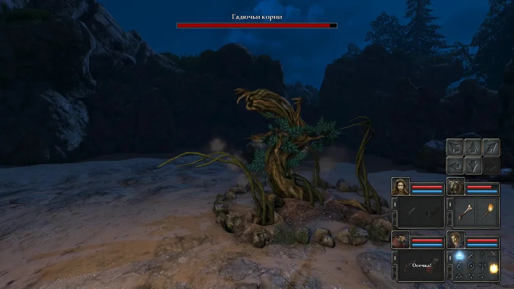 Становимся в круг, трубим в рог, появляется первый босс – Гадючьи корни.