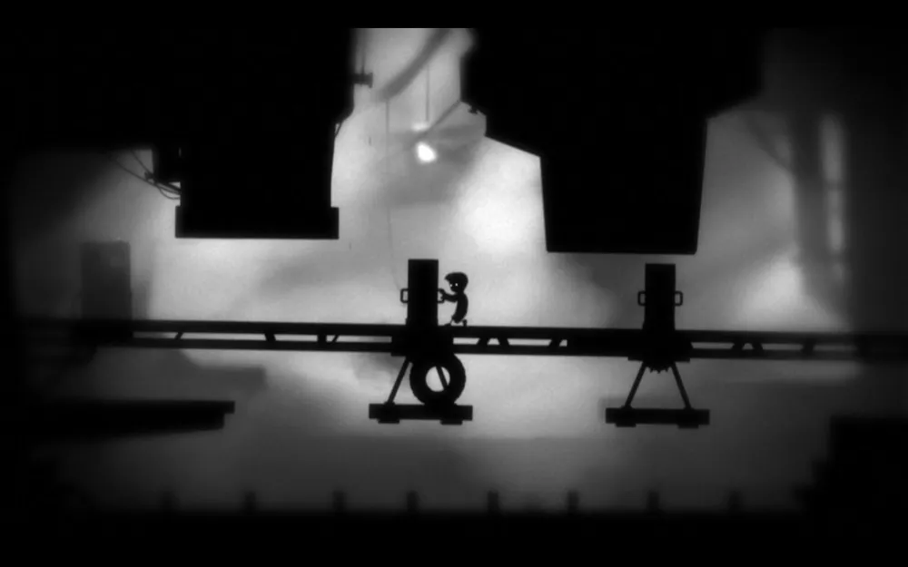 Взобравшись по второй лестнице, видим две висящие платформы. Для начала нам нужно перелезть первую, для этого оттягиваем ее вправо, перемещаемся на другую сторону, а затем тянем ее назад (где вы сейчас) по максимуму. Вторую платформу трогать не нужно, просто переберитесь к генератору и запускайте механизм. Не медля, бегите к первой (теперь) платформе, перепрыгивайте ее и двигайте максимально влево, так как сейчас появится колесо, и вам нужно его протащить так, чтобы оно не упало на конвейер. Катите первую платформу до второй и сразу переходите на нее. Если вы все сделали правильно, колесо должно упасть к кнопке, которая закрывала/открывала дверь. Спускаемся туда.